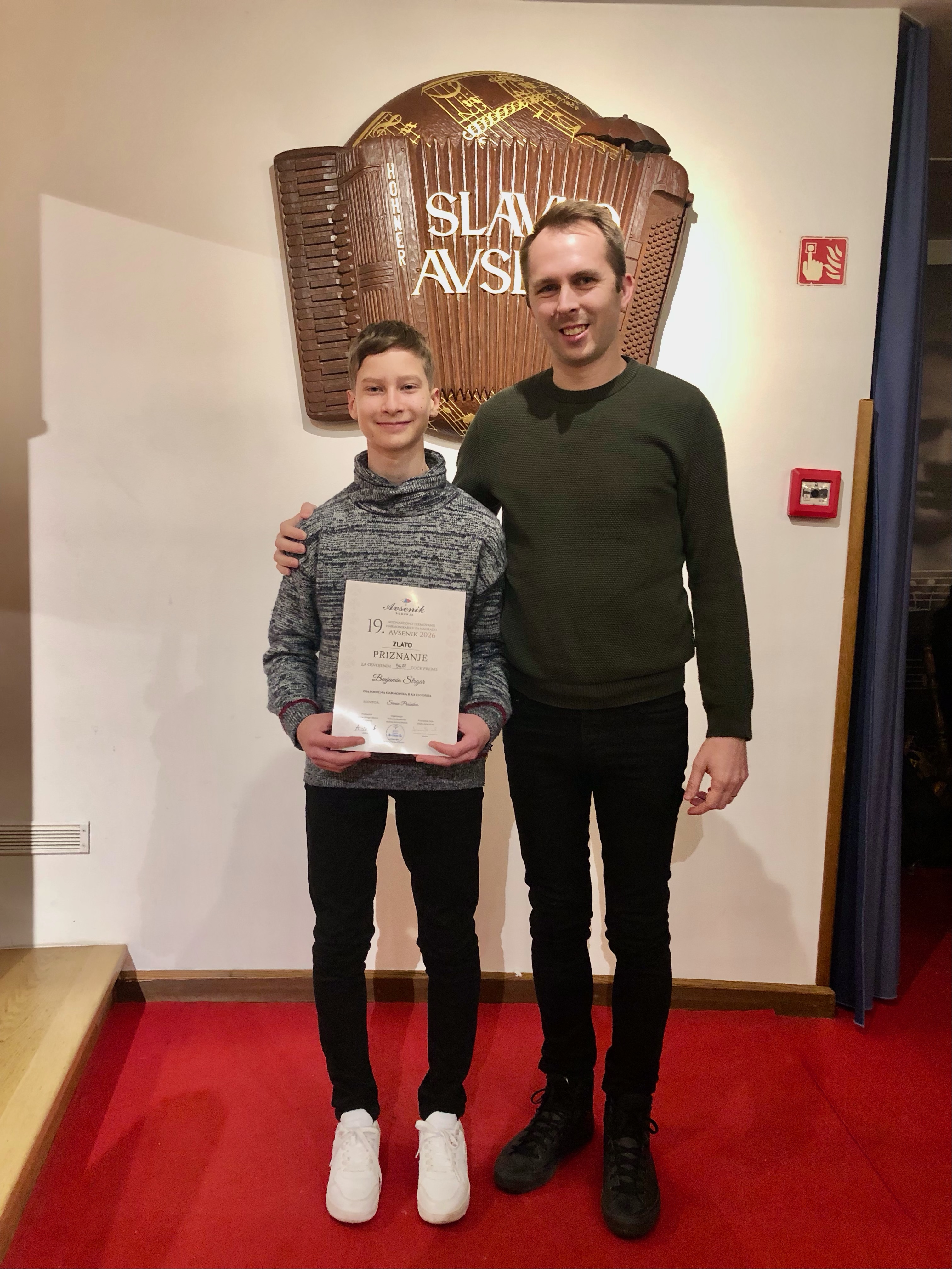Med 23. in 25. januarjem je v Begunjah na Gorenjskem potekalo 19. Mednarodno tekmovanje harmonikarjev za nagrado Avsenik, katerega se je udeležil tudi Benjamin Strgar. Pod mentorstvom prof. Simona Prašnikarja je z diatonično harmoniko nastopil v kategoriji B in dosegel zlato plaketo za osvojenih 96,77 točk. Benjaminu in njegovemu mentorju iskreno čestitamo!