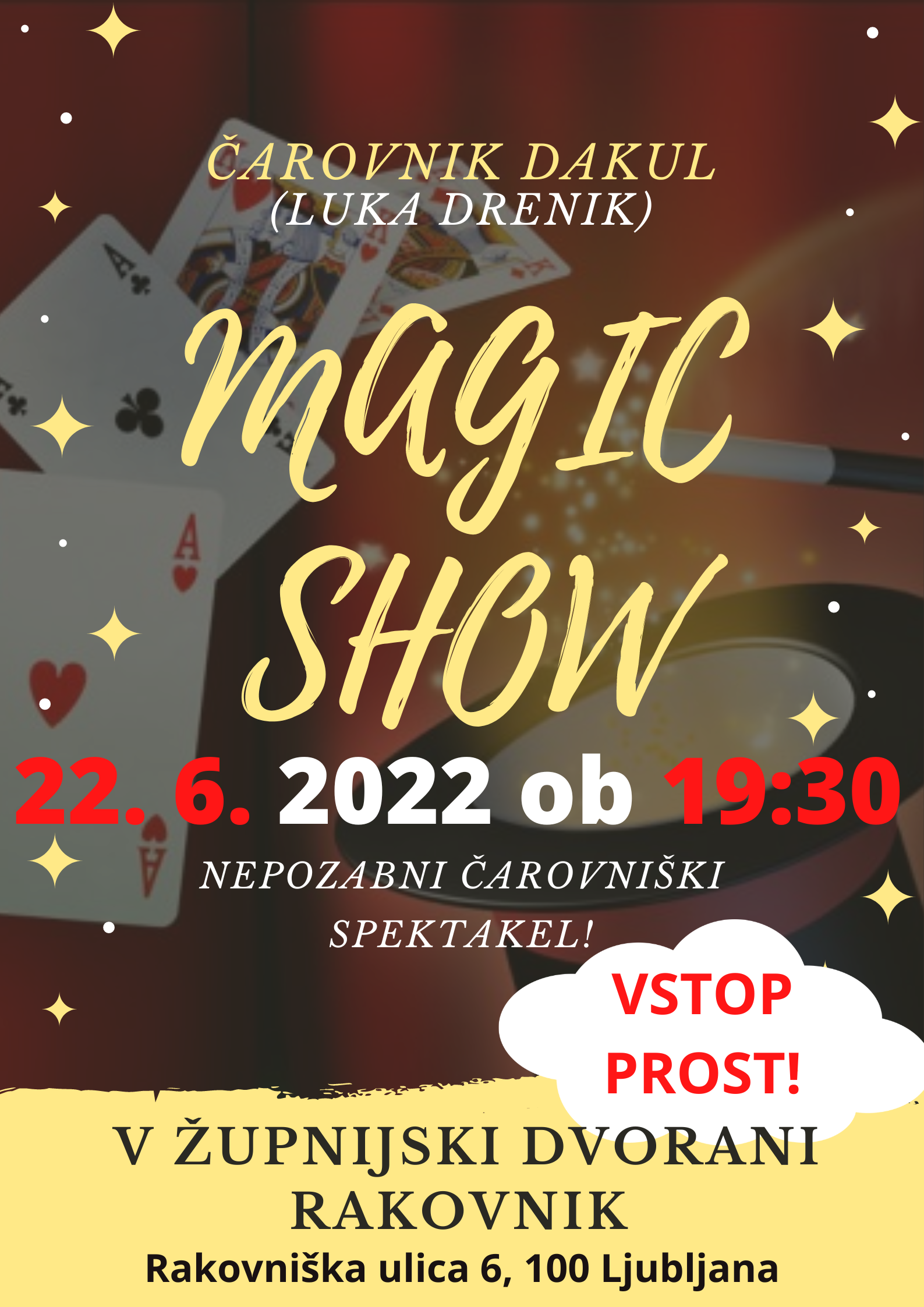 V sredo, 22. 6. ste ob 19.30 vabljeni na nepozaben čarovniški spektakel, ki bo potekal v župnijski dvorani. Vabljeni! Povejte prijateljem FacebookTwitterGoogle+WhatsAppViberEmailPrint