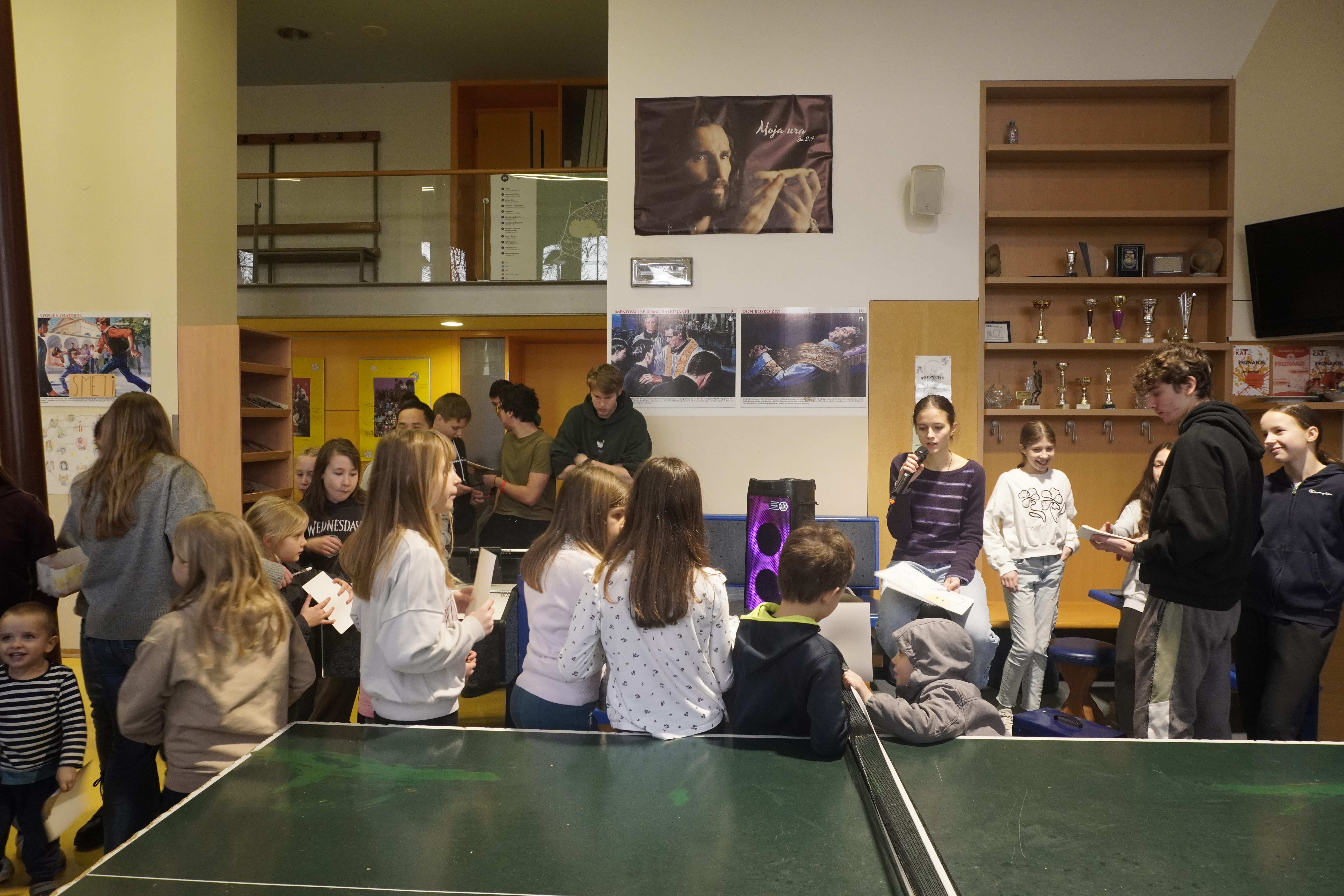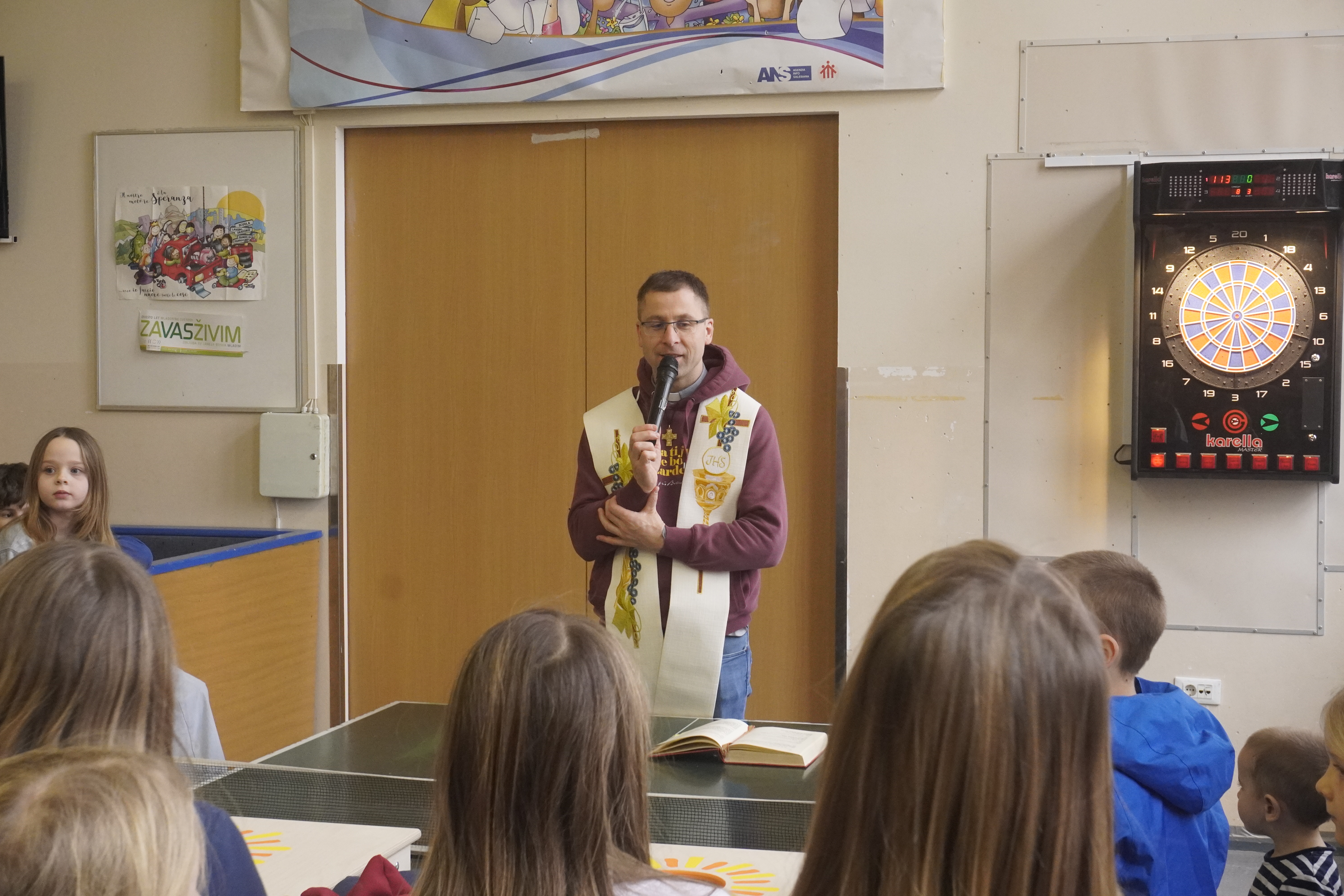 Don Boskov dan za otroke nas je popeljal v čas don Boskove prve misijonske odprave v Argentino. Za uvod smo zato zaplesali po ritmu pesmi »Bienvenido Don Bosco«. Sledila je dramska igrica, v kateri so animatorji uprizorili slovo prvih misijonarjev od don Boska in začetek misijonskega delovanja v daljni Patagoniji. Otroci so misijonarje začeli klicati Padre – oče, kar je zanje pomenilo, da so jih sprejeli. Nekaj prvih misijonskih pisem, ki so prevedena tudi v slovenščino, smo si z otroki po predstavi tudi pogledali. Pot nas je od nato vodila v cerkev pred Najsvetejše, kjer nas je za doživeto molitev pripravila sestra Dani. Naučili smo se molitev roke. Med tem ko so animatorji
