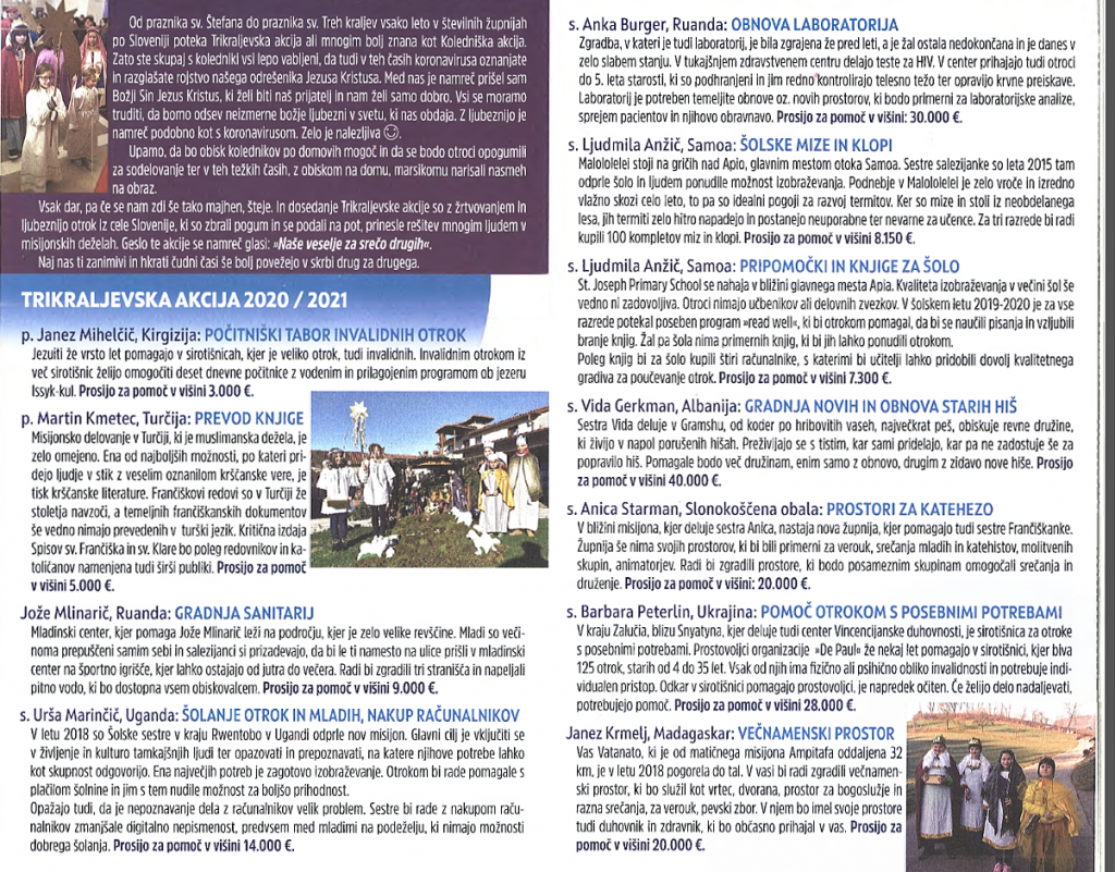 Projekte, za katere se zbirajo letošnja dobrodelna sredstva, opisuje spodnji letak, ki ga lahko dobite tudi v rakovniški cerkvi. V cerkvi si prav tako lahko vzamate trikraljevske nalepke 20 G + M + B 21.