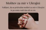 Vabljeni, da se vsak dan ob 20.00 pridružite molitvi za mir v Ukrajini in po svetu. Povezani v molitvi in zaupanju lahko izprosimo čudeže, zaupajmo v Marijo Pomočnico. molitev Povejte prijateljem FacebookTwitterGoogle+WhatsAppViberEmailPrint