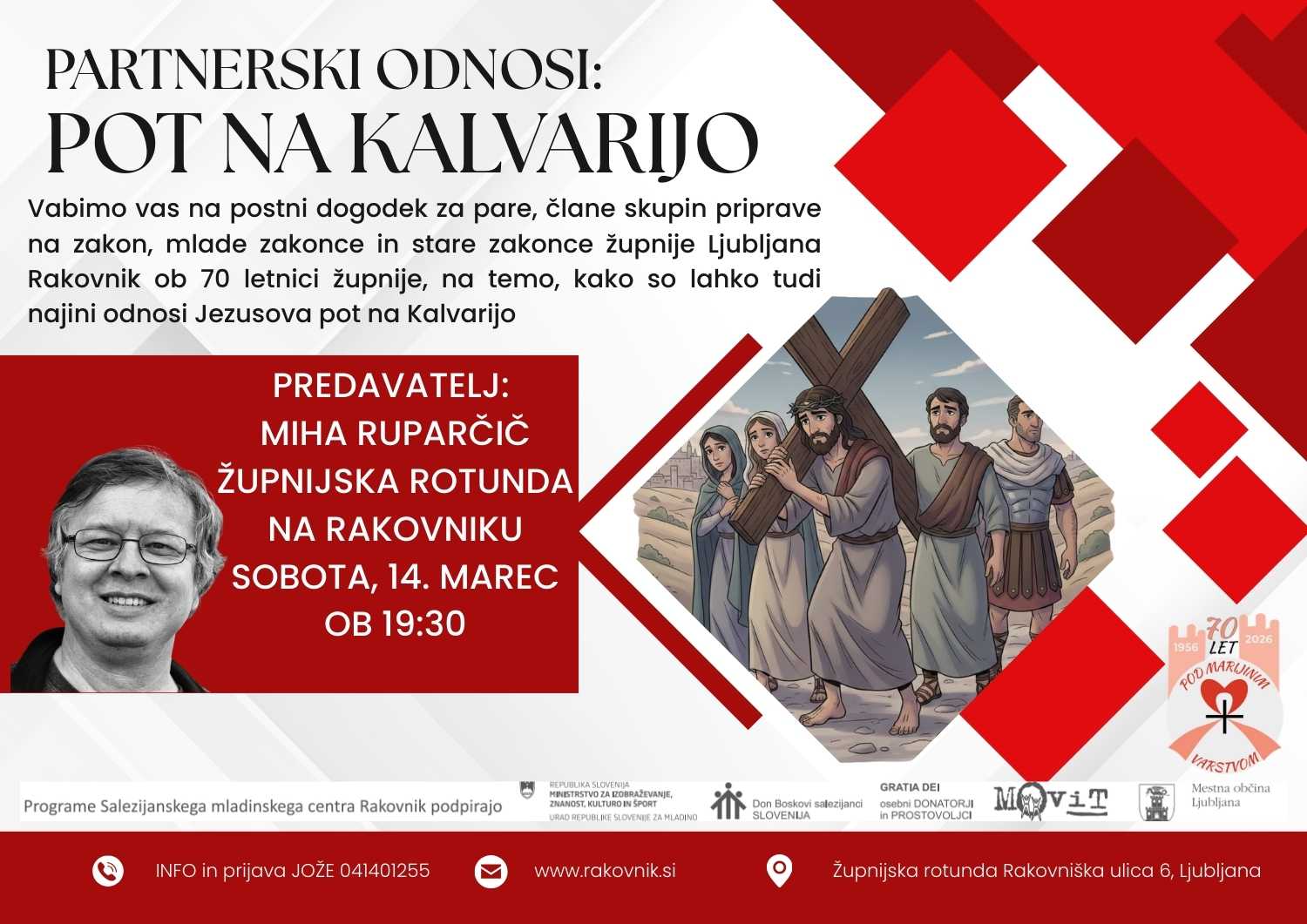 Vabimo vas na postni dogodek za pare, člane skupin priprave na zakon, mlade zakonce in stare zakonce župnije Ljubljana Rakovnik ob 70 letnici župnije, na temo, kako so lahko tudi najini odnosi Jezusova pot na Kalvarijo.