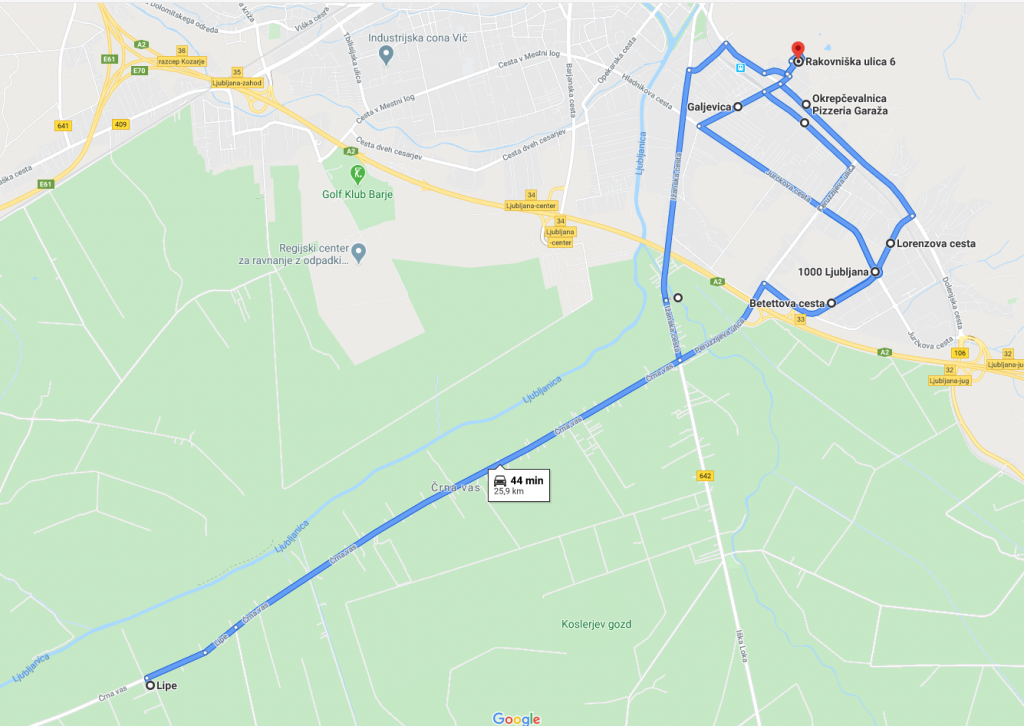 Rakovniška cerkev >> del Dolenjske c. do Orlove >> Orlova >> Ižanska c. do Črne vasi >> Črna vas do Lip in nazaj >> Ižanska c. do odcepa proti Mateni in nazaj >> del Peruzzijeve >> Bettetova >> Lorenzova do Hoferja >> del Dolenske c. do Galjevice >> Galjevica >> Jurčkova do krožišča pri L’Clercu in nazaj do Peruzzijeve >> del Peruzzijeve >> Ob dolenski železnici do Galjevice >> Rakovniška cerkev.