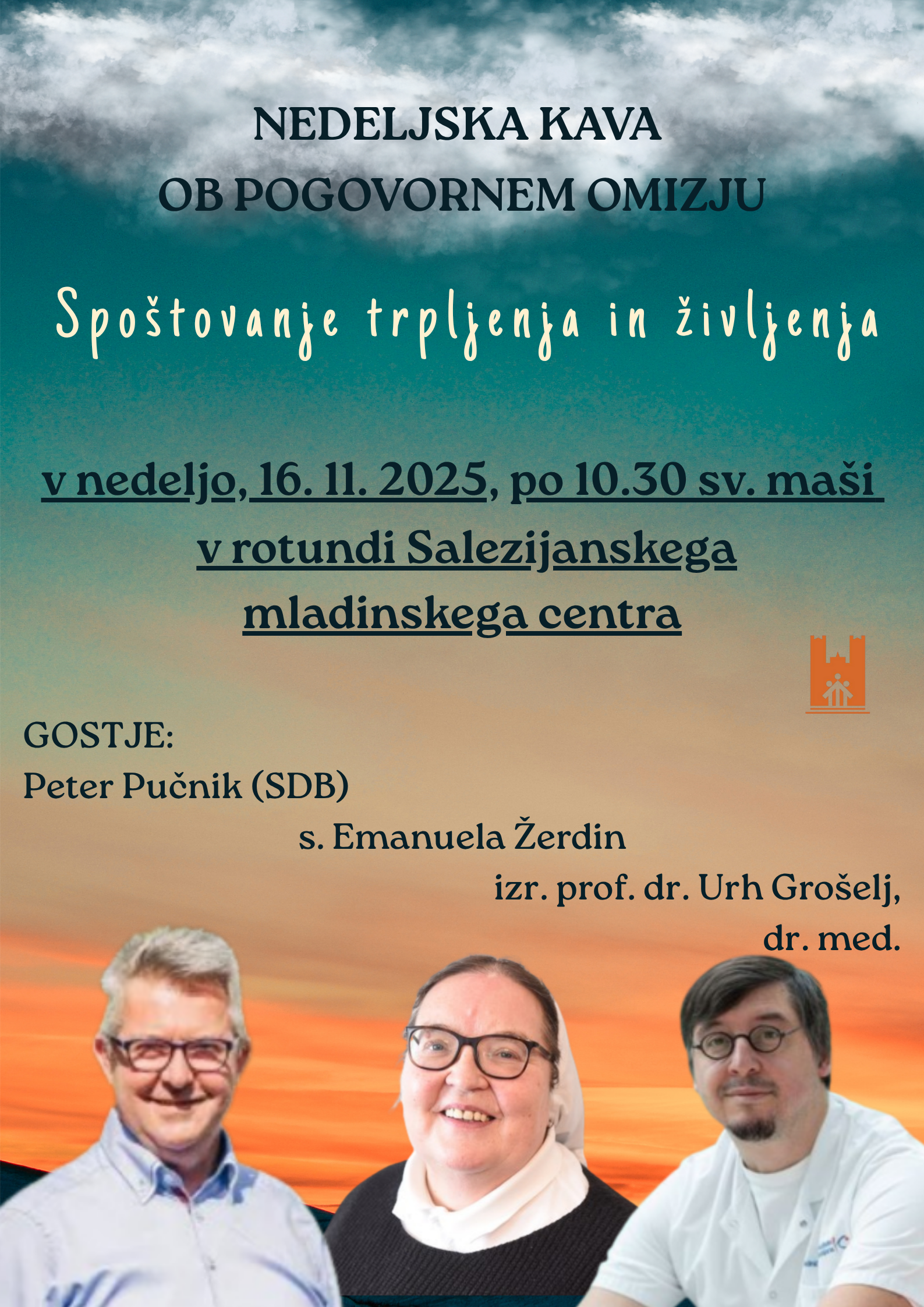 V nedeljo, 16. novembra 2025, po 10. 30 sveti maši bo v rotundi SMC-Rakovnik nedeljska kava s pogovornim omizjem z gosti, na temo Spoštovanja trpljenja in življenja. Gostje pogovornega omizja: sestra Emanuela Žerdin, salezijanec Peter Pučnik in izr. prof. dr. Urh Grošelj, dr. med.