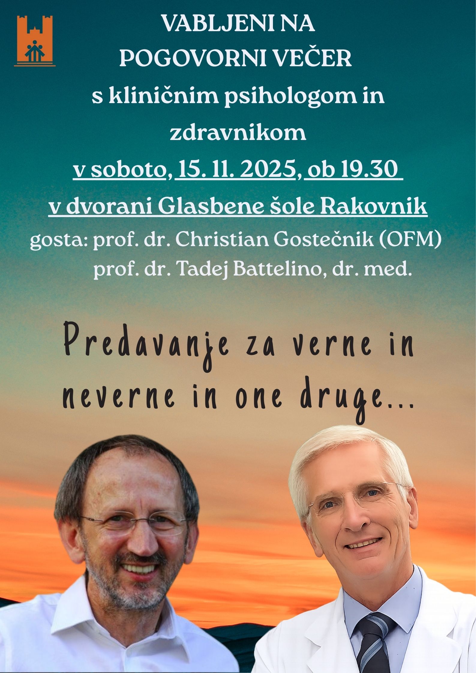 V soboto, 15. novembra 2025, ob 19.30 vabljeni na pogovorni večer z naslovom Spoštovanje trpljenja in življenja, ki bo potekal v dvorani Glasbene šole Rakovnik. Gosta večer: prof. dr. Christian Gostečnik in prof. dr. Tadej Battelino, dr. med. Pogovor bo povezoval Blaž Lesnik. Večer bo priložnost za spoštljiv in odprt pogovor ter za vprašanja, ki se dotikajo teme minljivosti in trpljenja.