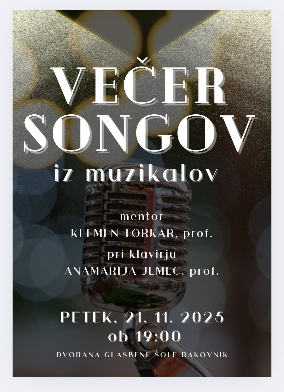 Prisrčno vabljeni na čaroben večer songov iz muzikalov, ki ga bodo s svojimi talenti in energijo napolnili mladi pevci pod mentorstvom prof. Klemna Torkarja.